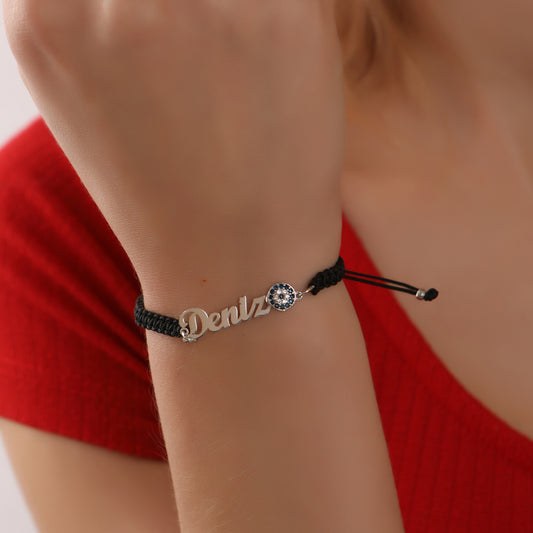 925 Ayar Gümüş Kişiye Özel Nazarlı İsimli İp Bileklik