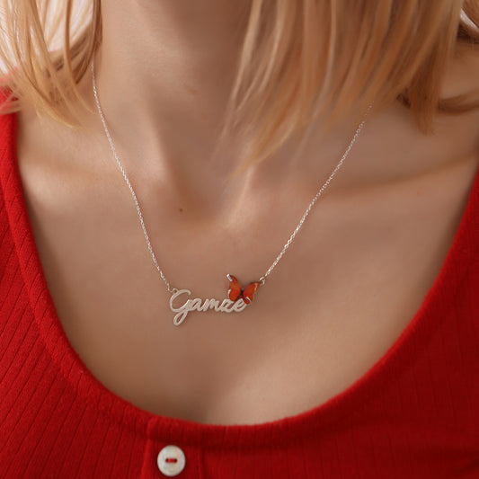 925 Ayar Gümüş Kişiye Özel Kırmızı Kelebek Tasarımlı İsim Kolye