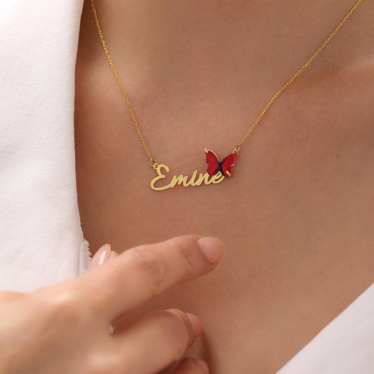925 Ayar Gümüş Kişiye Özel Kırmızı Kelebek Tasarımlı İsim Kolye