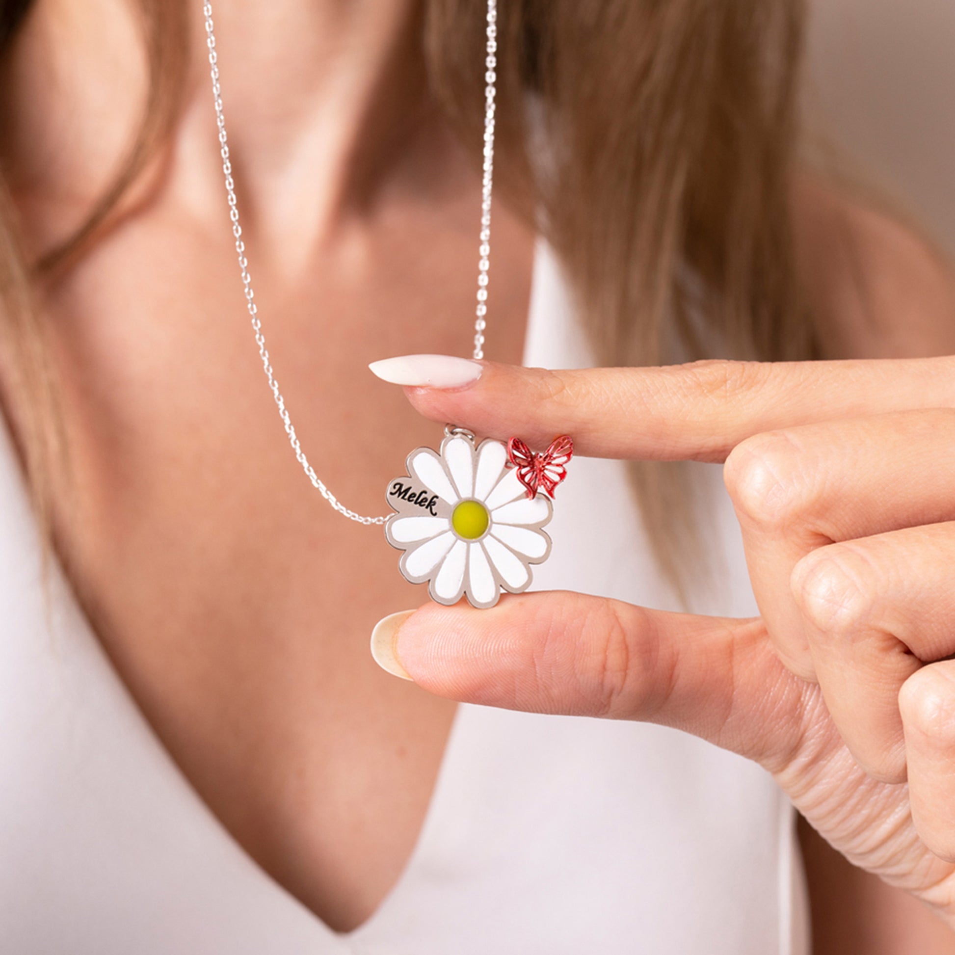 925 Ayar Gümüş Kişiye Özel Kelebek Detaylı Papatya Kolye