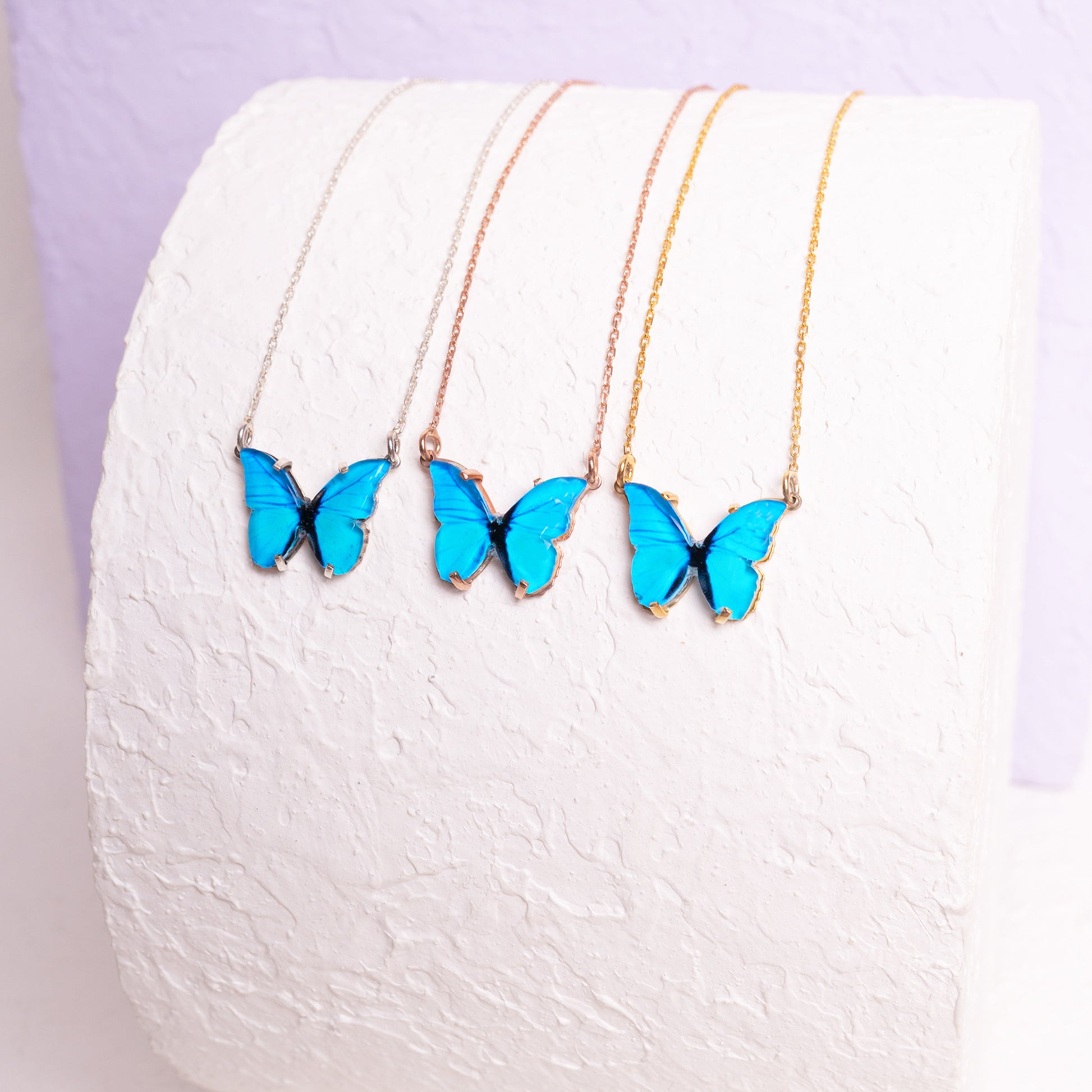 925 Ayar Gümüş Mavi Kelebek Tasarımlı Kolye